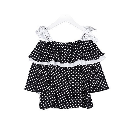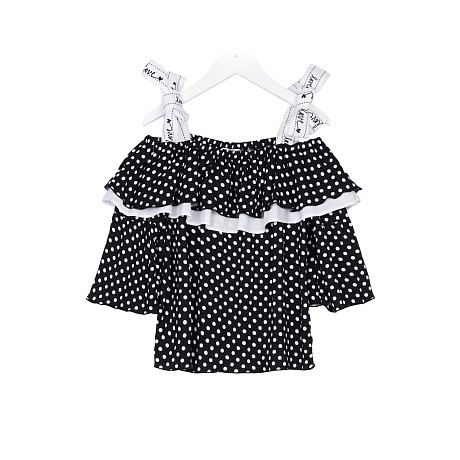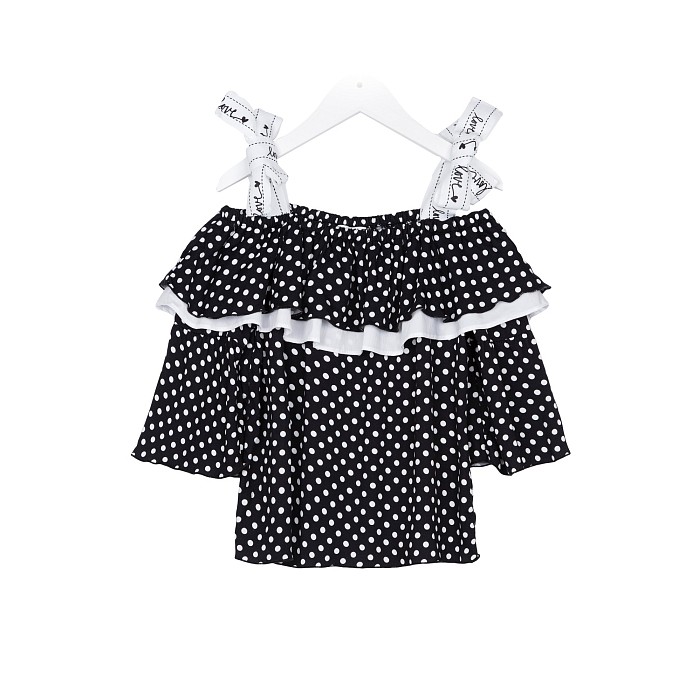 Блуза Elsy с принтом в горошек и оборками – идеальный выбор для маленьких модниц! Изготовлена из 100% вискозы и 72% хлопка, дополнена эластичными оборками и белыми бантиками на плечах. Прекрасный дизайн в стиле ретро с белыми точками на черном фоне делает эту блузу стильной и нежной. На фотографиях видны аккуратные оборки по краю и белые бантики на плечах, которые создают очаровательный и элегантный образ. Качество от итальянского бренда и внимание к деталям делают эту блузу отличным выбором для вашего ребенка!