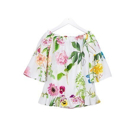 Блуза Elsy с очаровательным цветочным принтом и элегантным дизайном – идеальный выбор для вашего маленькой принцессы! Изготовлена из 100% полиэстера, блуза обеспечивает комфорт и удобство. На фотографии видны разноцветные цветы и листья на белом фоне, а также нежная рюшевая отделка по низу. Блуза с элегантным открытым вырезом и рукавами-фонариками подчеркивает нежность и изысканность. Качество от итальянского бренда и внимание к деталям делают эту блузу отличным выбором для вашего ребенка!