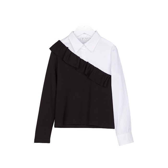Блуза Elsy – это стильный и комфортный выбор для маленьких модниц! Изготовлена из смеси хлопка и вискозы, она сочетает в себе черный и белый цвета, что делает её идеальным аксессуаром для различных нарядов. Контрастный рукав и воротник придают блузке уникальный и элегантный вид. На фотографии видна аккуратная отделка воротника и рукавов, а также удобная застежка на пуговицы. Бренд Elsy известен своими качественными и стильными изделиями, которые идеально подойдут для вашего ребенка!