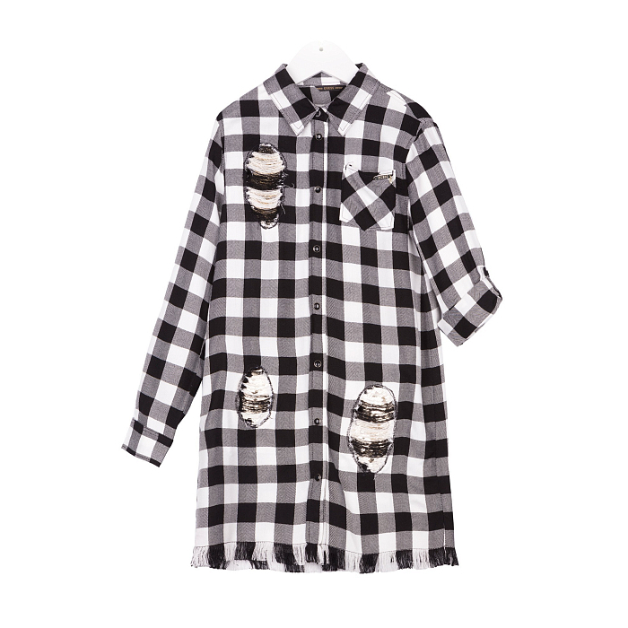 Блузка для девочек с черно-белым клетчатым принтом и рваными деталями