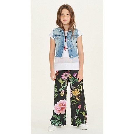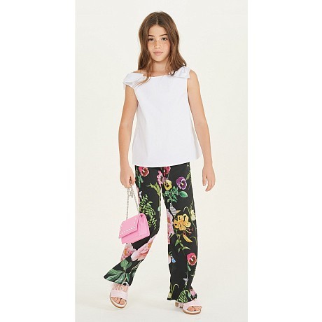 Брюки для девочек Elsy – это идеальный выбор для весны! Изготовленные из 100% полиэстера с подкладкой из 100% хлопка, они украшены изысканным цветочным принтом. На брюках видны большие розовые пионы, нежные лилии, яркие фиалки и зеленые листья на черном фоне. Качество от итальянского бренда Elsy и внимание к деталям делают эти брюки отличным выбором для вашего ребенка!
