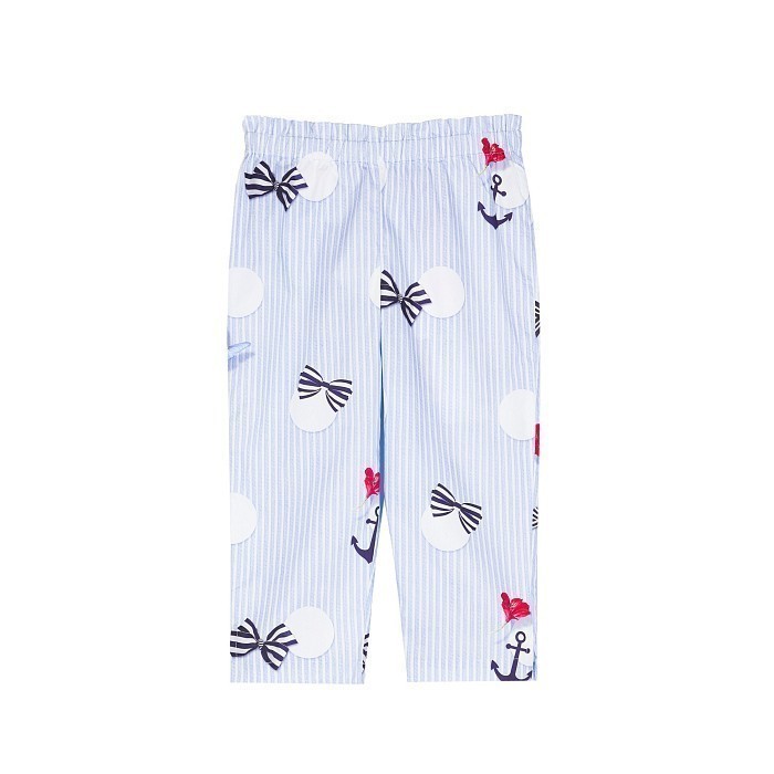 Брюки для девочек Lapin House – это идеальный выбор для вашего маленькой модницы! Изготовленные из 98% хлопка и 2% лайкры, они оформлены очаровательными бантиками и якорями на белом фоне с синими полосками. Благодаря эластичной резинке на талии, брюки удобно сидят и не сдавливают животик. На фотографиях видны аккуратные бантики, якоря и белые круги на синих полосках. Качество от бренда из Греции и внимание к деталям делают эти брюки отличным выбором для вашего ребенка!