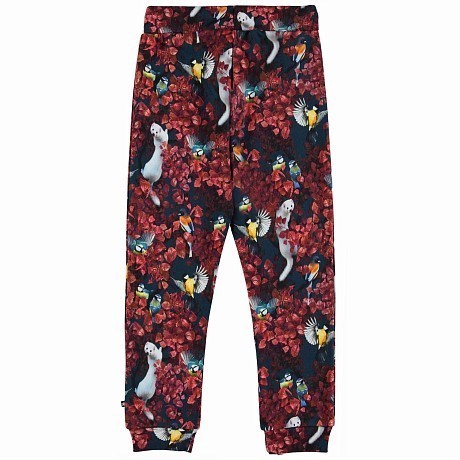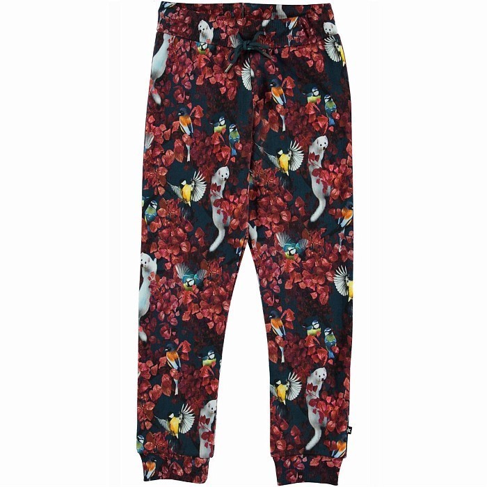 Брюки для девочек Molo – это идеальный выбор для стильных и комфортных образов! Изготовленные из 100% хлопка, они украшены оригинальным принтом с изображением птиц и красных листьев на черном фоне. Нежная ткань и стильный дизайн создают идеальную посадку, обеспечивая комфорт и удобство. На фотографиях видны аккуратные детали, такие как эластичная резинка на поясе и удобная застежка. Качество от бренда из Индии делает эти брюки отличным выбором для вашего ребенка!