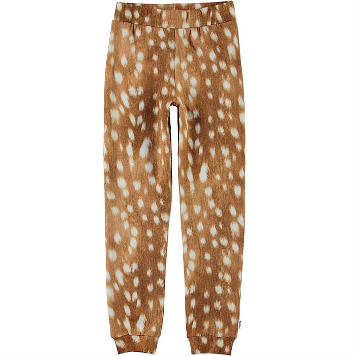 Трикотажные брюки для девочек Molo – это идеальный выбор для активного дня! Изготовленные из 100% органического хлопка, они украшены очаровательными белыми оленями на коричневом фоне. Мягкая ткань с приятным ощущением и эластичная резинка по талии делают эти брюки удобными и комфортными для вашего ребенка. На фотографии видна аккуратная белая контрастная окантовка по краю и мягкая текстура ткани. Качество от бренда из Дании и внимание к деталям делают эту модель отличным выбором для вашего малыша!