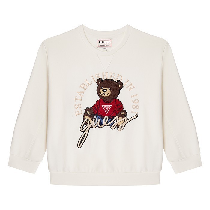 - 🎨 Дизайн: медведь в красной куртке, треугольный логотип Guess, надпись "ESTABLISHED IN 1981", кремовая основа