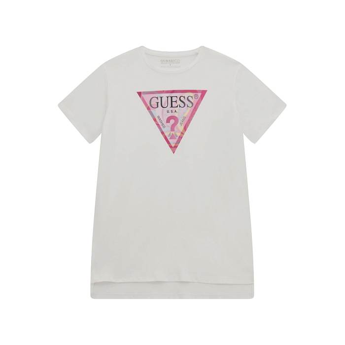 Футболка Guess – это идеальный выбор для девочек от 12 до 16 лет! Изготовленная из 95% хлопка и 5% эластана, она украшена ярким принтом треугольника с надписью Guess. Белая основа с красочным принтом создает стильный и современный образ. На фотографиях видна аккуратная окантовка по краю и мягкая текстура ткани. Качество от бренда из США и внимание к деталям делают эту футболку отличным выбором для вашего подростка!