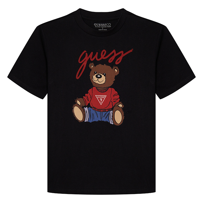 Футболка Guess – это идеальный выбор для девочек! Изготовленная из 100% хлопка, она украшена очаровательным принтом медведя в красной кофточке, синих штанах и бежевыми носками. Черная основа с яркими красными и бежевыми акцентами создает стильный и в то же время уютный образ. На фотографиях видна аккуратная красная контрастная окантовка по краю и мягкая текстура ткани. Качество от бренда из США и внимание к деталям делают эту футболку отличным выбором для вашего ребенка!
