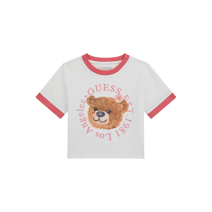 Футболка для девочки Guess – это идеальный выбор для юных модниц! Изготовленная из 95% хлопка и 5% эластана, она украшена очаровательным принтом медведя с цветочком на белом фоне. Нежная белая основа с ярким розовым принтом медведя и надписью Los Angeles создает неповторимое сочетание стиля и уюта. На фотографиях видна аккуратная розовая окантовка по краю и мягкая текстура ткани. Качество от американского бренда Guess и внимание к деталям делают эту футболку отличным выбором для вашего ребенка!