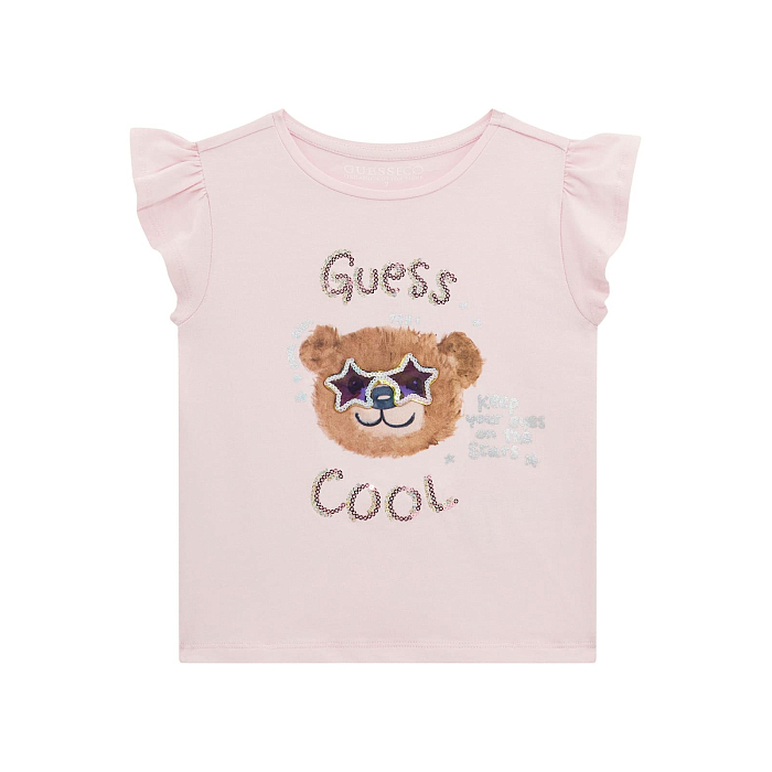 Футболка для девочки Guess – это идеальный выбор для стильных и нежных малышек! Изготовленная из 95% хлопка и 5% эластана, она украшена очаровательным принтом медведя с звездами и очками. Розовый цвет создает нежное и в то же время яркое настроение. На фотографиях видна аккуратная розовая окантовка по краю и мягкая текстура ткани. Качество от бренда из США и внимание к деталям делают эту футболку отличным выбором для вашего ребенка!
