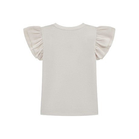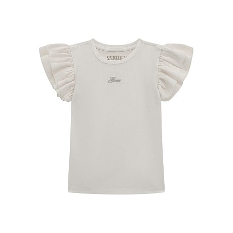 Футболка Guess – это идеальный выбор для маленьких модниц! Изготовленная из 95% хлопка и 5% эластана, она украшена элегантными воланами на рукавах и дополнена эластичной отделкой. Белый цвет подчеркивает нежность и простоту, а воланы придают модели легкость и шарм. На фотографиях видны аккуратные складки на рукавах и мягкая текстура ткани. Качество от американского бренда Guess делает эту футболку отличным выбором для вашего ребенка!