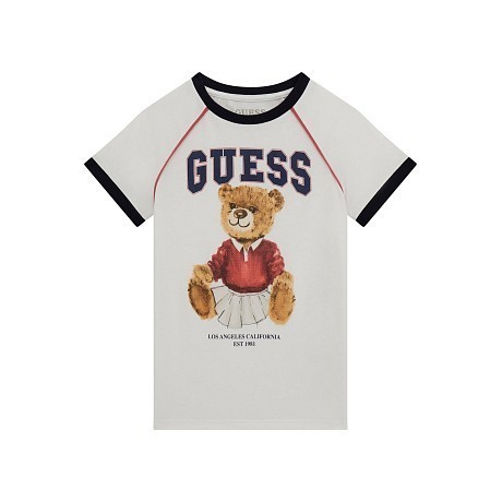 Футболка Guess – это идеальный выбор для девочек! Изготовленная из 100% хлопка, она украшена очаровательным принтом медведя в красной рубашке и юбке. Нежная белая основа с яркими красными и синими акцентами создает игривое и в то же время стильное настроение. На фотографиях видна аккуратная красная контрастная окантовка по краю и мягкая текстура ткани. Качество от бренда из США и внимание к деталям делают эту футболку отличным выбором для вашего ребенка!