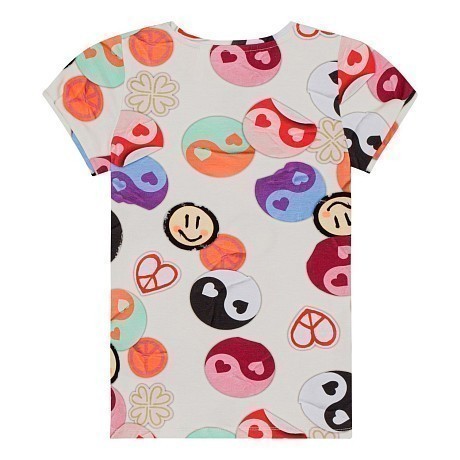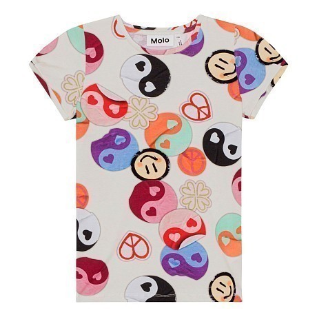 Футболка для девочек Molo – это идеальный выбор для маленьких модниц! Изготовленная из 95% натурального хлопка и 5% эластана, она создает идеальный баланс между мягкостью и эластичностью. Футболка украшена ярким принтом с символами мира, сердец и улыбок на светло-бежевом фоне. Нежная текстура ткани и удобная посадка делают эту футболку отличным выбором для вашего ребенка. На фотографиях видны яркие символы мира, сердец и улыбок, а также аккуратные края и мягкое воротничок. Качество от бренда из Дании и внимание к деталям делают эту футболку отличным выбором для вашего малыша!