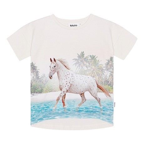 Футболка Molo – это идеальный выбор для девочек! Изготовленная из 95% хлопка и 5% эластана, она украшена очаровательным принтом лошади на пляже. На футболке изображена белая лошадь с коричневыми пятнами, которая бежит по синему морю. Футболка с круглым вырезом горловины и короткими рукавами создает комфорт и стиль для вашего ребенка. На фотографиях видна аккуратная белая окантовка по краю и мягкая текстура ткани. Качество от бренда из Дании и внимание к деталям делают эту футболку отличным выбором для вашего девочки!