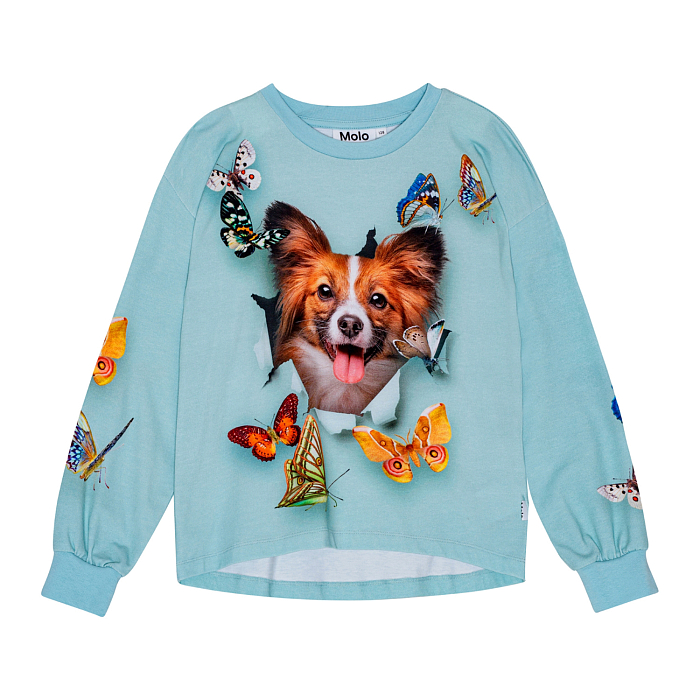 Голубая футболка с длинным рукавом с принтом собаки и бабочек для девочек
