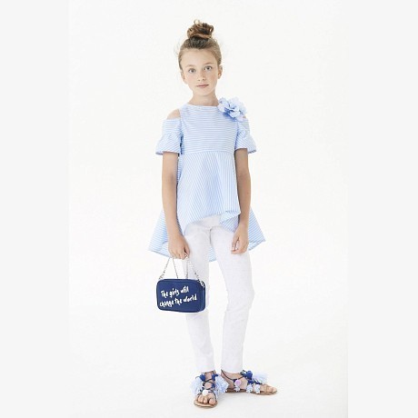 Блуза для девочек Elsy – это идеальный выбор для стильных и нежных образов! Изготовленная из 100% хлопка, она украшена очаровательными голубыми полосками и открытыми плечами. Нежная голубая основа с белыми полосами создает легкий и элегантный настрой. На фотографии видна аккуратная голубая окантовка по краю и мягкая текстура ткани. Качество от бренда из Албании и внимание к деталям делают эту блузу отличным выбором для вашего ребенка!