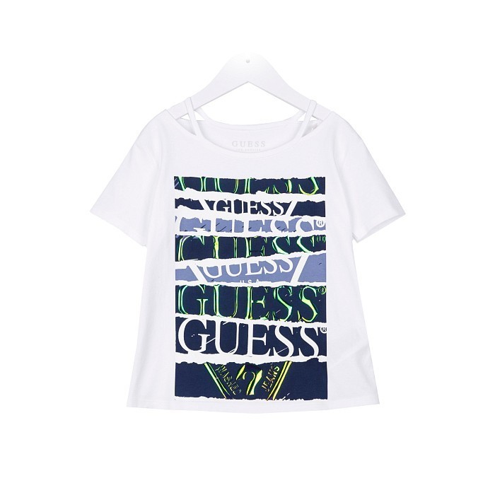 Белая блузка Guess – это идеальный выбор для стильных девочек! Изготовленная из 95% хлопка и 5% эластана, она украшена ярким принтом с логотипом Guess. Белый фон блузки с черными и зелеными элементами создает модный и современный образ. На фотографии видна аккуратная белая окантовка по краю и мягкая текстура ткани. Качество от бренда из Индии и внимание к деталям делают эту блузку отличным выбором для вашего ребенка!