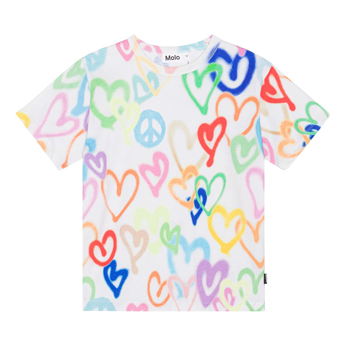 Футболка Molo – это идеальный выбор для девочек! Изготовленная из 100% натурального хлопка, она украшена яркими сердечками и символами мира на белом фоне. Нежная белая основа с разноцветными сердечками и символами мира создает радостное и в то же время спокойное настроение. На фотографиях видна аккуратная окантовка по краю и мягкая текстура ткани. Качество от бренда из Дании и внимание к деталям делают эту футболку отличным выбором для вашего ребенка!