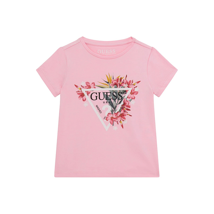 Футболка Guess – это идеальный выбор для маленьких модниц! Изготовленная из 95% хлопка и 5% эластана, она украшена ярким принтом цветов и логотипом Guess. Нежная розовая основа с цветочным принтом и логотипом Guess создает стильный и комфортный образ. На фотографиях видна аккуратная вышивка логотипа и цветы вокруг логотипа, а также мягкая текстура ткани. Качество от бренда из США и внимание к деталям делают эту футболку отличным выбором для вашего ребенка!