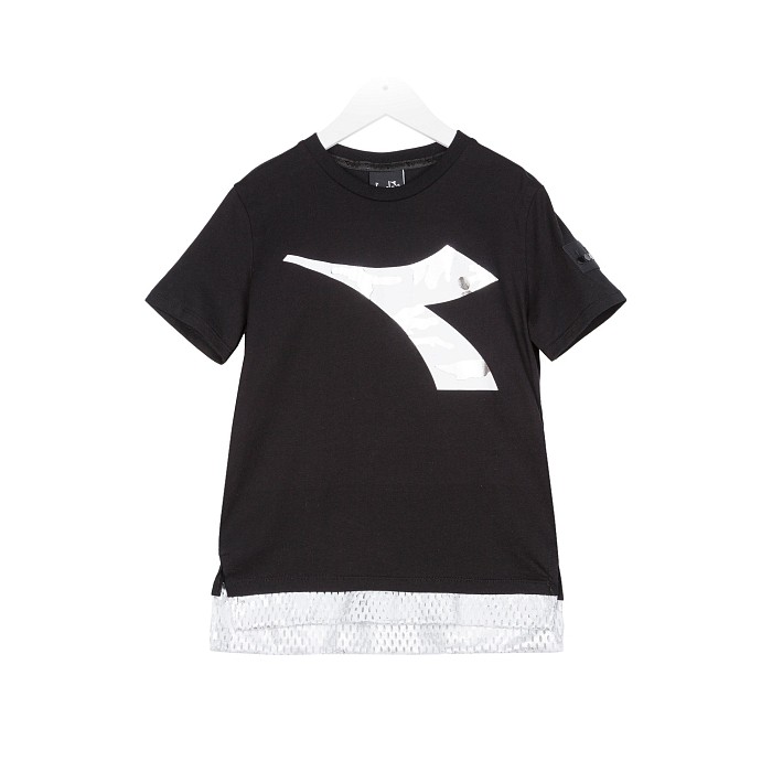 Футболка Diadora – это идеальный выбор для маленьких модниц! Изготовленная из 100% хлопка, она украшена стильным принтом в виде белой абстрактной формы на черном фоне. Футболка с круглым вырезом горловины и короткими рукавами создает комфорт и стиль. На фотографии видна аккуратная белая контрастная окантовка по краю и мягкая текстура ткани. Качество от итальянского бренда и внимание к деталям делают эту футболку отличным выбором для вашего ребенка!