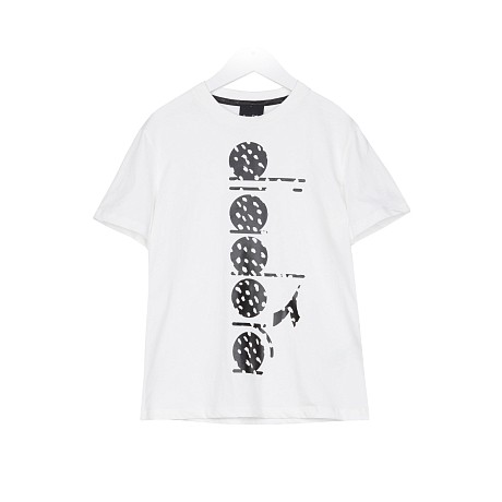 Футболка Diadora – это отличный выбор для девочек! Изготовленная из 100% хлопка, она украшена оригинальным принтом с черными точками на белом фоне. Принт выполнен в стиле Diadora, создавая уникальный и модный образ. Футболка с круглым вырезом горловины и короткими рукавами подойдет для девочек любого возраста. На фотографии видна аккуратная текстура ткани и четкий принт. Качество от итальянского бренда Diadora делает эту футболку отличным выбором для вашего ребенка!