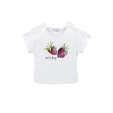 Футболка Elsy – это идеальный выбор для маленьких модниц! Изготовленная из 95% хлопка и 5% эластана, она украшена очаровательным принтом ягод и рюшами на плечах. Яркие розовые и фиолетовые ягоды на белом фоне создают легкое и весеннее настроение. На фотографии видны аккуратные рюши на плечах и мягкая текстура ткани. Качество от бренда из Италии и внимание к деталям делают эту футболку отличным выбором для вашего ребенка!