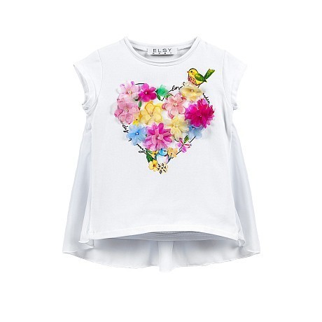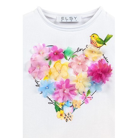 Футболка Elsy – это идеальный выбор для маленьких модниц! Изготовленная из комбинации хлопка и эластана, она украшена изысканным цветочным принтом и милой птичкой. На футболке видны яркие розовые, желтые, фиолетовые и белые цветы, а также маленькая птичка, создающая волшебную атмосферу. Нежная ткань и удобная посадка делают эту футболку комфортной и стильной. Качество от итальянского бренда Elsy и внимание к деталям делают эту футболку отличным выбором для вашего ребенка!