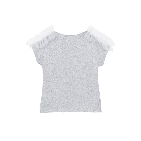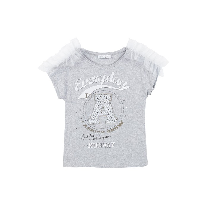Футболка Elsy – это идеальный выбор для маленьких модниц! Изготовленная из комбинации 95% хлопка и 5% эластана, она дополнена кружевными рукавами и стильным принтом с буквой "A" и надписью "Everyday is a fashion show". Нежная ткань и эластичные рукава создают комфорт и стильный образ. На фото видна аккуратная кружевная отделка на рукавах и стильный принт с блестками. Качество от итальянского бренда Elsy делает эту футболку отличным выбором для вашего ребенка!