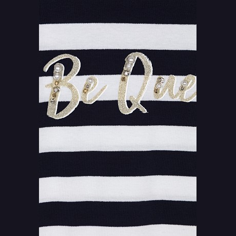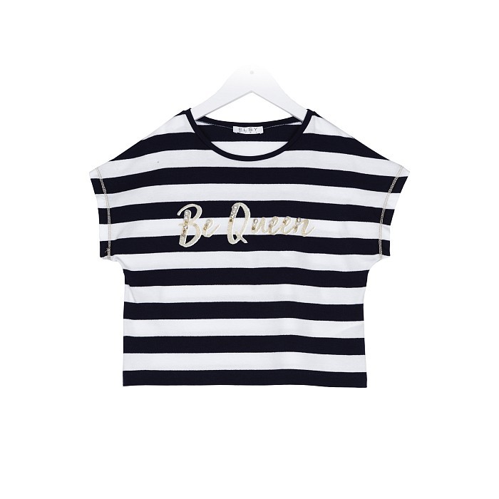 Футболка Elsy с надписью Be Queen – это идеальный выбор для маленьких модниц! Изготовленная из 93% хлопка, 5% эластана, 1% полиэстера и 1% полиамида, она сочетает в себе комфорт и стиль. Черно-белые полосы и золотистая надпись Be Queen делают эту футболку не только удобной, но и очень модной. На фотографии видна аккуратная вышивка и мягкая текстура ткани. Качество от итальянского бренда Elsy и внимание к деталям делают эту футболку отличным выбором для вашего ребенка!
