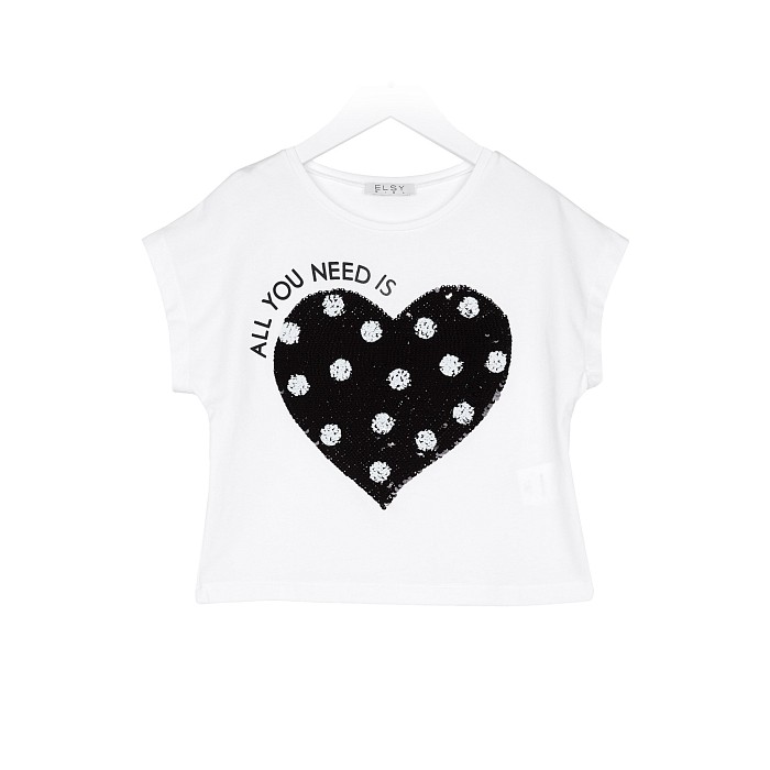 Футболка Elsy – это идеальный выбор для маленьких модниц! Изготовлена из 95% хлопка и 5% эластана, она украшена очаровательным принтом сердца с надписью 'All you need is'. Футболка идеально подходит для девочек любого возраста, благодаря мягкому и эластичному составу. На фотографии видно, как футболка сидит на девочке, подчеркивая её стиль и комфорт. Качество от итальянского бренда Elsy делает эту футболку отличным выбором для вашего ребенка!