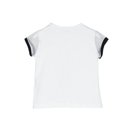 Футболка Elsy – это идеальный выбор для маленьких модниц! Изготовленная из 95% хлопка и 5% эластана, она дополнена стильным принтом балерины и собаки. Футболка с белым фоном, украшенная синими и белыми точками, создает нежное и в то же время забавное настроение. На фотографии видна аккуратная синяя контрастная окантовка по краю и мягкая текстура ткани. Качество от бренда из Италии и внимание к деталям делают эту футболку отличным выбором для вашего ребенка!