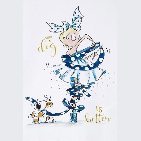 - 🎨 Дизайн: балерина, собака, синие и белые точки, синяя окантовка