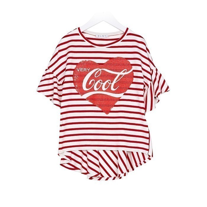 Футболка Elsy – это идеальный выбор для стильных девочек! Изготовлена из комбинированного материала 93% вискоза, 3% эластан, 2% полиамид, 2% полиэстер, что обеспечивает мягкость и эластичность. На футболке яркий принт сердца с надписью "Very Cool" в центре, что делает её не только удобной, но и модной. Футболка с круглым вырезом и короткими рукавами подойдет для девочек любого возраста. На фотографиях видна яркая красная окантовка по краю и мягкая текстура ткани. Качество от итальянского бренда Elsy и внимание к деталям делают эту футболку отличным выбором для вашего ребенка!