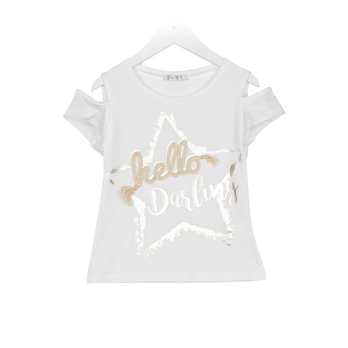 Футболка Elsy – это идеальный выбор для девочек! Изготовленная из 95% хлопка и 5% эластана, она украшена очаровательным принтом звезды с надписью Hello Darling. Нежная белая основа с золотистой звездой и надписью создает игривое и вдохновляющее настроение. На фотографии видна аккуратная золотистая контрастная окантовка по краю и мягкая текстура ткани. Качество от бренда из Италии и внимание к деталям делают эту футболку отличным выбором для вашего ребенка!