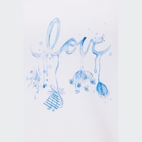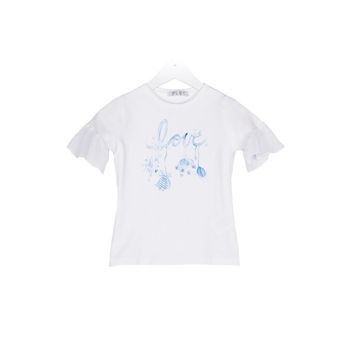 Футболка для девочек Elsy – это идеальный выбор для маленьких модниц! Изготовленная из комбинации 95% хлопка и 5% эластана, она дополнена ярким принтом Love. Футболка выполнена в белом цвете с нежным голубым принтом, который состоит из надписи Love и маленьких деталей, таких как сердечки и цветы. Нежная текстура ткани и удобная посадка делают эту футболку комфортной и стильной. На фотографии видна аккуратная отделка по краю и мягкая текстура ткани. Качество от итальянского бренда Elsy и внимание к деталям делают эту футболку отличным выбором для вашего ребенка!
