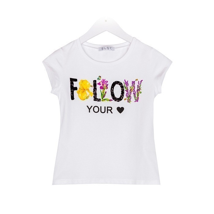 Футболка Elsy – это идеальный выбор для вашего ребенка! Изготовленная из 95% хлопка и 5% эластана, она украшена ярким принтом цветов и надписью "Follow Your Heart". Футболка выполнена в стиле Италии, где внимание к деталям и качество материала делают эту вещь отличным выбором для вашего ребенка. На фотографии видна аккуратная вышивка цветов и надписи, а также мягкая текстура ткани. Качество от бренда из Италии и внимание к деталям делают эту футболку отличным выбором для вашего малыша!