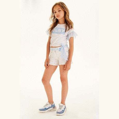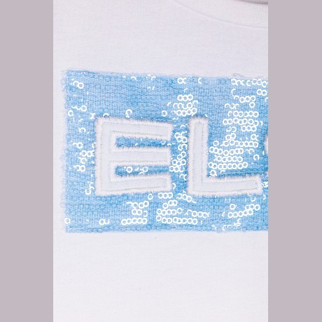 Футболка для девочек Elsy – это идеальный выбор для маленьких модниц! Изготовленная из комбинации 95% хлопка и 5% эластана, она обеспечивает идеальную посадку и комфорт. Футболка украшена крупным принтом Elsy, выполненным в синем цвете на белом фоне. Принт включает в себя логотип Elsy и дополнительные элементы, которые делают эту футболку необычной и стильной. На фотографиях видна аккуратная голубая контрастная окантовка по краю и мягкая текстура ткани. Качество от бренда из Италии и внимание к деталям делают эту футболку отличным выбором для вашего ребенка!