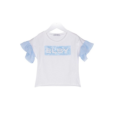 Футболка Elsy – это идеальный выбор для девочек! Изготовленная из комбинации 95% хлопка и 5% эластана, она дополнена 100% полиэстером для дополнительной прочности. Футболка украшена оригинальным голубым принтом с надписью "ELSY" и рукавами с голубой окантовкой. Нежная ткань и стильный дизайн делают эту футболку отличным выбором для вашего ребенка!
