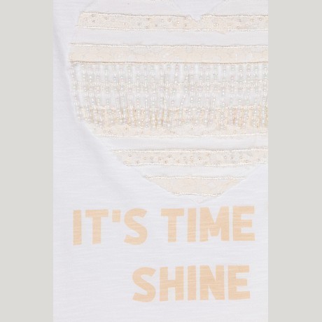 Футболка Elsy – это идеальный выбор для девочек! Изготовленная из 100% хлопка, она украшена очаровательным принтом сердца с надписью 'It's time to shine'. Нежная белая основа с изящным сердечком и надписью создает нежное и в то же время стильное настроение. На фотографии видна аккуратная вышивка и мягкость ткани. Качество от бренда из Италии и внимание к деталям делают эту футболку отличным выбором для вашего ребенка!