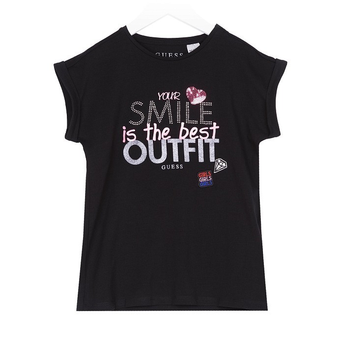 Футболка Guess для девочек – это идеальный выбор для стильных и уверенных в себе девочек! Изготовленная из 95% хлопка и 5% эластана, она украшена ярким принтом с надписью Your Smile is the best outfit. Футболка черного цвета с белым и розовым текстом, сердечком и бриллиантом создает неповторимый стиль и уверенность. На фотографии видна аккуратная вышивка и мягкая текстура ткани. Качество от бренда из Бангладеш и внимание к деталям делают эту футболку отличным выбором для вашего ребенка!