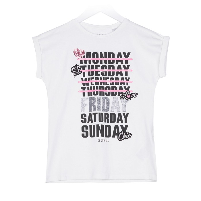 Футболка Guess для девочек – это стильный и комфортный выбор! Изготовлена из 95% хлопка и 5% эластана, она украшена ярким принтом с днями недели и розовыми линиями. Футболка идеально подходит для девочек от 14 до 16 лет. На фото видна аккуратная вышивка с днями недели и розовые линии, которые создают легкую и веселую атмосферу. Качество от бренда Guess из Бангладеш и внимание к деталям делают эту футболку отличным выбором для вашего ребенка!