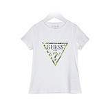 Футболка Guess для девочек – это стильный и удобный выбор! Изготовлена из 95% хлопка и 5% эластана, она идеально подойдет для активного отдыха и игр. Футболка украшена ярким принтом Guess в виде треугольника с контрастными линиями и надписью "WASHED" и "JEANS". Нежная белая основа с ярким принтом создает модный и современный образ. На фотографии видна округлая горловина и короткие рукава, а также мягкая текстура ткани. Качество от бренда из Индии и внимание к деталям делают эту футболку отличным выбором для вашего ребенка!