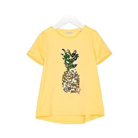 Футболка Guess – это идеальный выбор для маленьких модниц! Изготовленная из 95% хлопка и 5% других волокон, она украшена ярким дизайном ананаса из пайеток. Желтый цвет и зеленые пайетки создают яркий и веселый образ. На фотографии видна аккуратная отделка по краю и мягкая текстура ткани. Качество от бренда из США и внимание к деталям делают эту футболку отличным выбором для вашего ребенка!