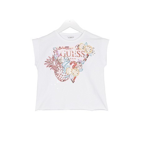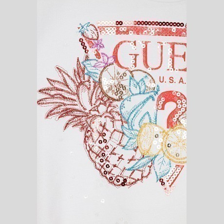 Футболка Guess – это идеальный выбор для маленьких модниц! Изготовленная из 95% хлопка и 5% других волокон, она украшена ярким принтом с фруктами, включая ананас, лимон, апельсин и клубнику. На белом фоне принт выглядит особенно нарядно и привлекательно. Футболка с круглым вырезом и короткими рукавами подчеркивает стиль и комфорт. Качество от бренда Guess и внимание к деталям делают эту футболку отличным выбором для вашего ребенка!