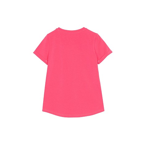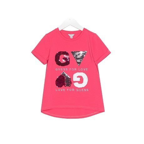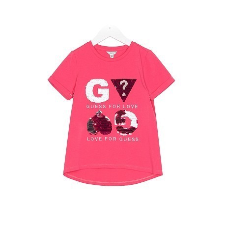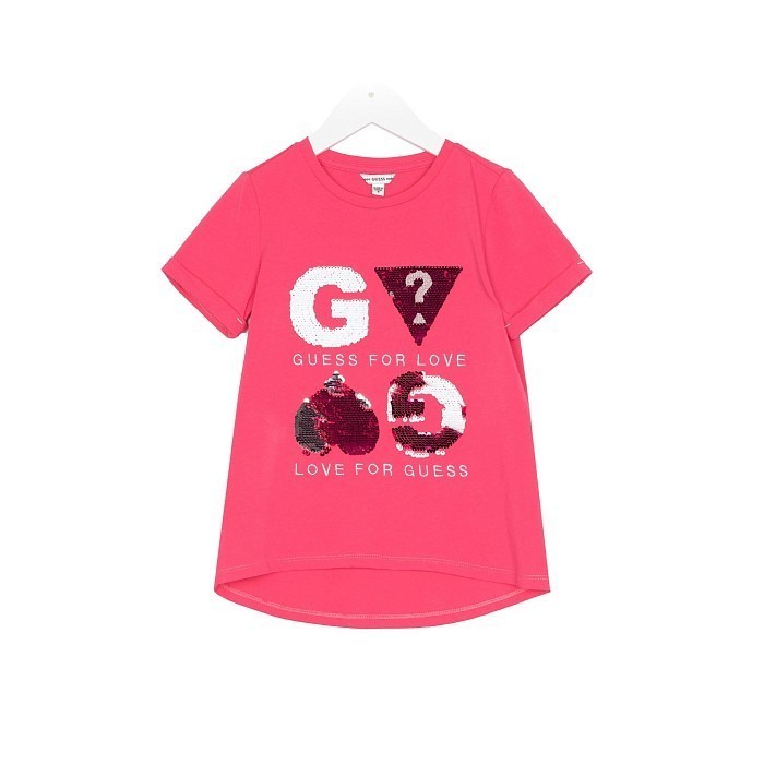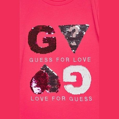 Футболка Guess – это идеальный выбор для маленьких модниц! Изготовленная из 95% хлопка и 5% других волокон, она украшена ярким принтом с пайетками и надписью "Guess for Love". Футболка идеально подходит для девочек благодаря стильному дизайну и качеству материала. На фотографии видна яркая красная футболка с белым принтом и пайетками, создающими эффект блеска. Качество от бренда Guess и внимание к деталям делают эту футболку отличным выбором для вашего ребенка!