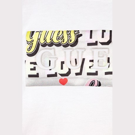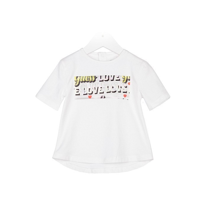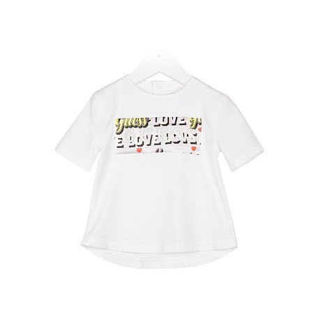 Футболка для девочек Guess – это идеальный выбор для маленьких модниц! Изготовленная из 95% хлопка и 5% эластана, она украшена очаровательным принтом Love и сердечками. Нежная белая основа с яркими надписями и сердечками создает игривое и вдохновляющее настроение. На фотографии видна аккуратная застежка на кнопки и мягкая текстура ткани. Качество от бренда из США и внимание к деталям делают эту футболку отличным выбором для вашего малыша!
