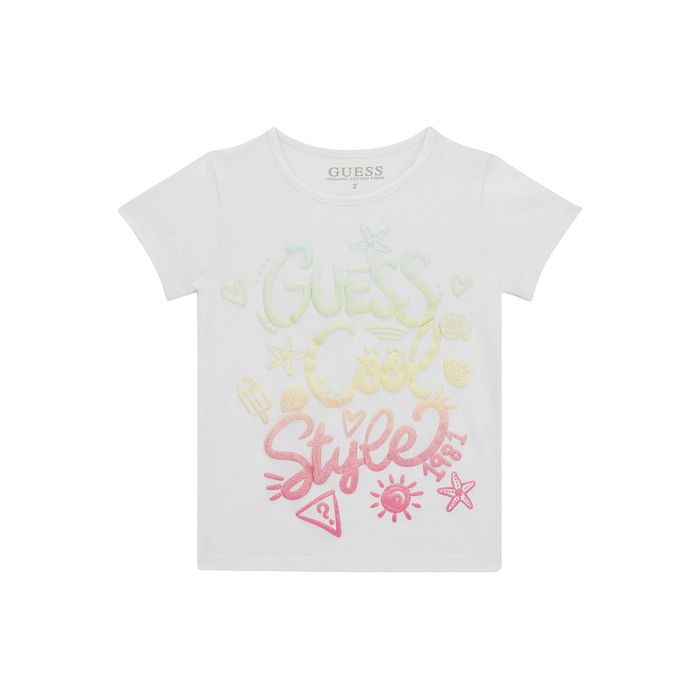 Футболка Guess для девочек – это идеальный выбор для стильных маленьких модниц! Изготовленная из 95% хлопка и 5% эластана, она украшена ярким принтом Guess Cool Style с сердечками, звездочками и надписью "Guess". Нежная белая основа с яркими цветными элементами создает яркий и стильный образ. На фотографиях видна аккуратная вышивка по центру и мягкая текстура ткани. Качество от бренда из США и внимание к деталям делают эту футболку отличным выбором для вашего ребенка!
