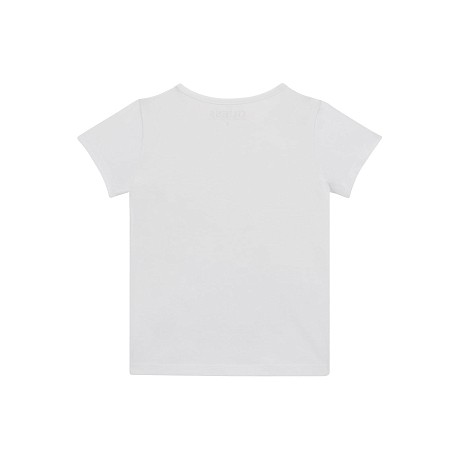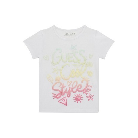 Футболка Guess для девочек – это идеальный выбор для стильных маленьких модниц! Изготовленная из 95% хлопка и 5% эластана, она украшена ярким принтом Guess Cool Style с сердечками, звездочками и надписью "Guess". Нежная белая основа с яркими цветными элементами создает яркий и стильный образ. На фотографиях видна аккуратная вышивка по центру и мягкая текстура ткани. Качество от бренда из США и внимание к деталям делают эту футболку отличным выбором для вашего ребенка!