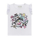 Футболка Guess – это идеальный выбор для маленьких модниц! Изготовленная из 95% хлопка и 5% эластана, она украшена ярким принтом с надписью "Guess" и множеством веселых элементов, таких как единорог, солнце, сердечки и другие. Футболка с фатиновыми рукавами добавляет нежности и шарма. Нежная белая основа с яркими цветами создает веселое и позитивное настроение. На фотографиях видна аккуратная белая окантовка по краю и мягкая текстура ткани. Качество от бренда из США и внимание к деталям делают эту футболку отличным выбором для вашего ребенка!