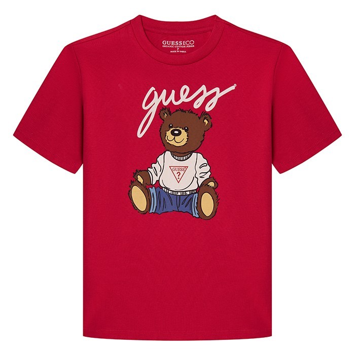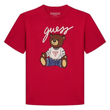 Футболка Guess – это идеальный выбор для девочек! Изготовленная из 100% хлопка, она украшена красным принтом медведя в белой футболке и синих штанах. На передней части футболки виден логотип Guess. Нежная красная основа с ярким принтом создает яркое и веселое настроение. На фотографиях видна аккуратная белая окантовка по краю и мягкая текстура ткани. Качество от бренда из США и внимание к деталям делают эту футболку отличным выбором для вашего ребенка!
