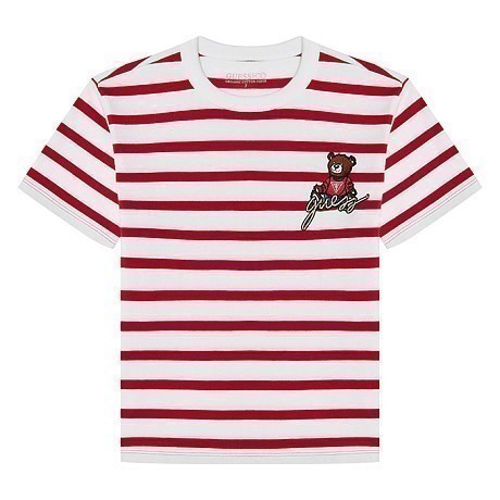 Футболка Guess – это идеальный выбор для маленьких модниц! Изготовленная из 100% хлопка, она украшена красными полосками и милым принтом медведя. Мягкая и приятная на ощупь ткань создает комфорт для вашего ребенка. На фотографиях виден аккуратный принт медведя с надписью "Guess" и красные полосы на белом фоне. Качество от бренда из США и внимание к деталям делают эту футболку отличным выбором для вашего ребенка!